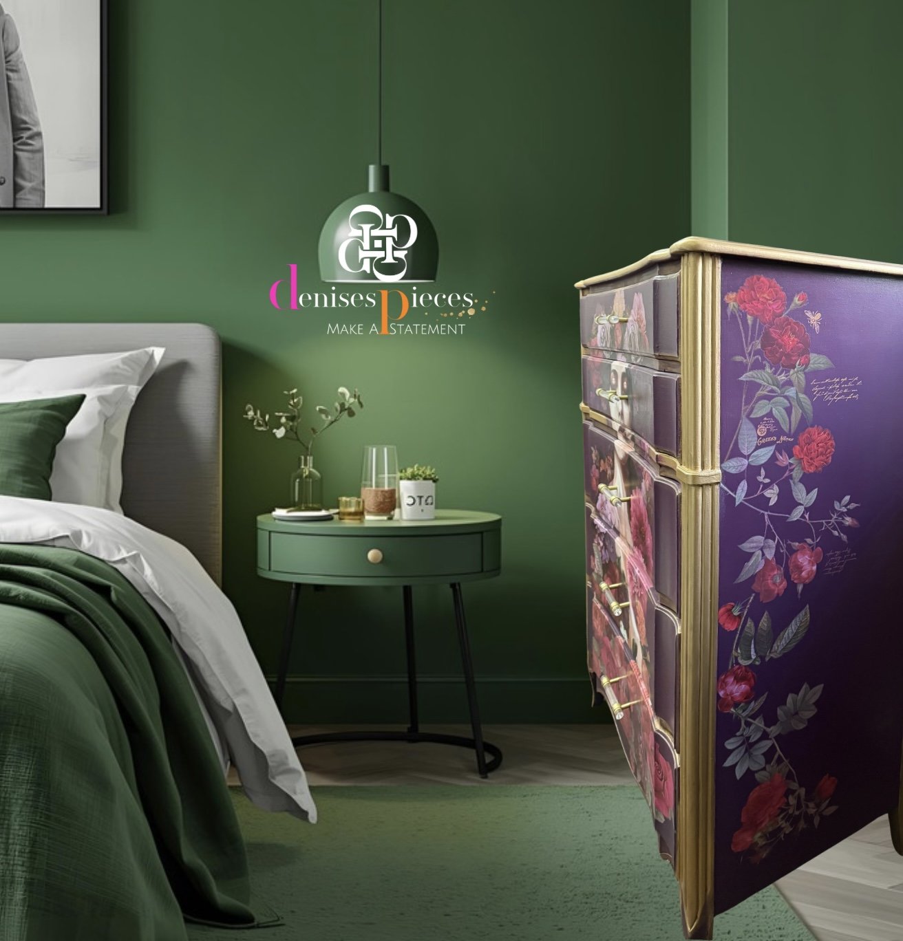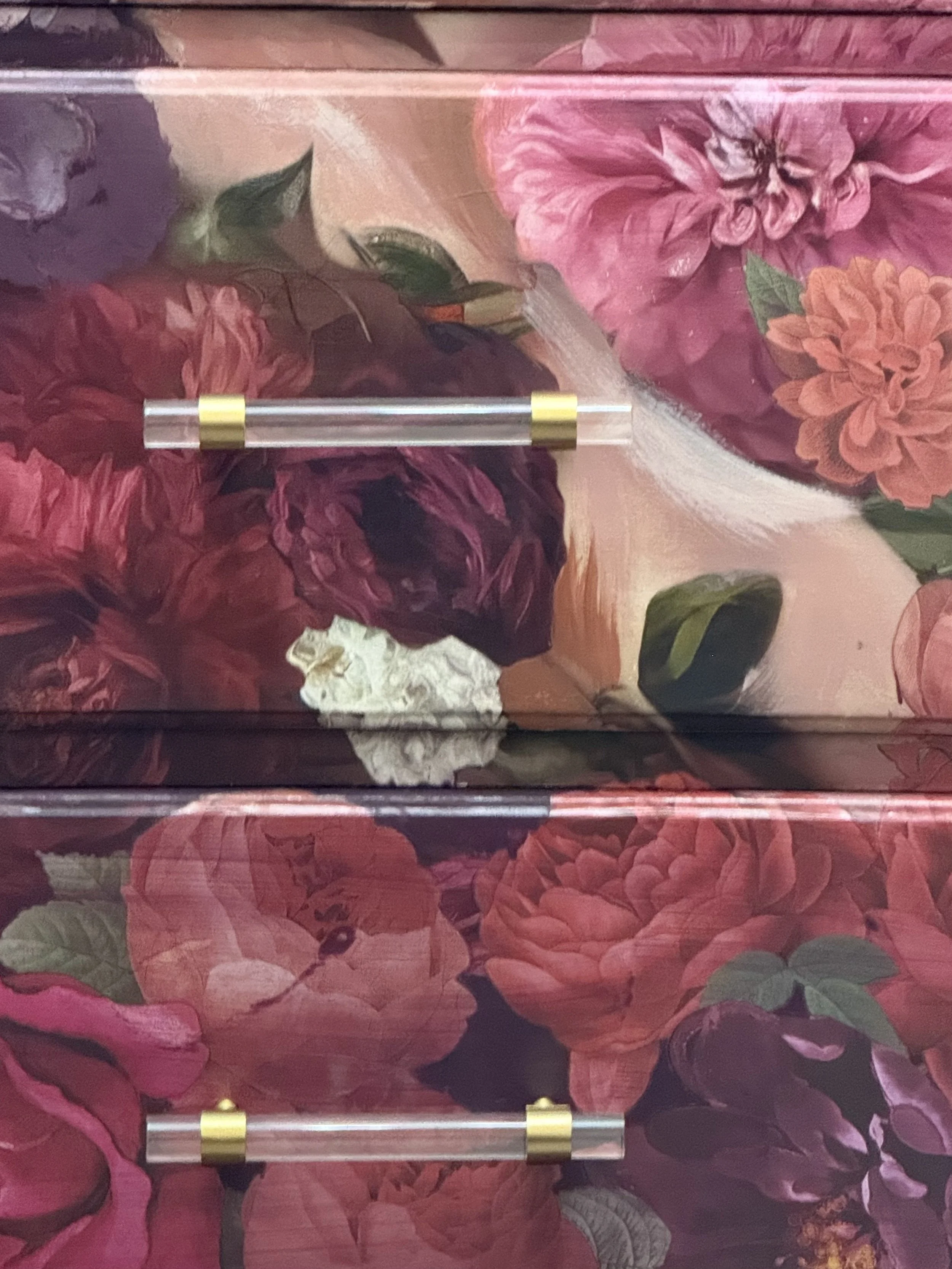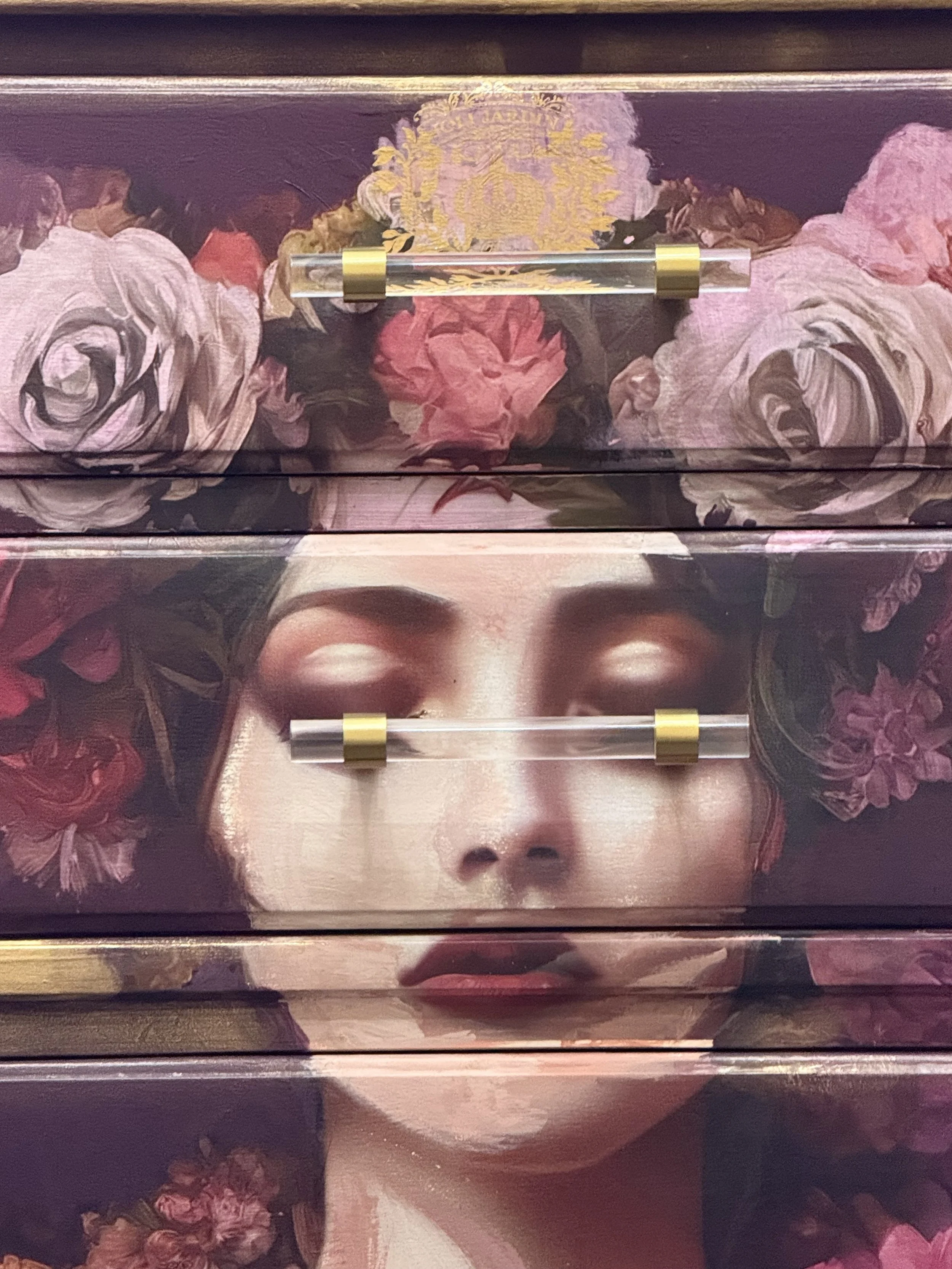 It all begins with an idea. I’ve had this stunning image in my stash for quite a while just waiting for the perfect piece to complement it.. This exquisite chest of drawers came along and it was a match!!! Customer mixed hot pinks and purple with loads of florals and gold wax, this piece is a true maximalist and really makes a statement.. The sides of the drawers are decoupaged with florals and the drawers are lined with a complementing heavy duty bright gold geometric paper. Brand new lucite hardware adds the final touch..