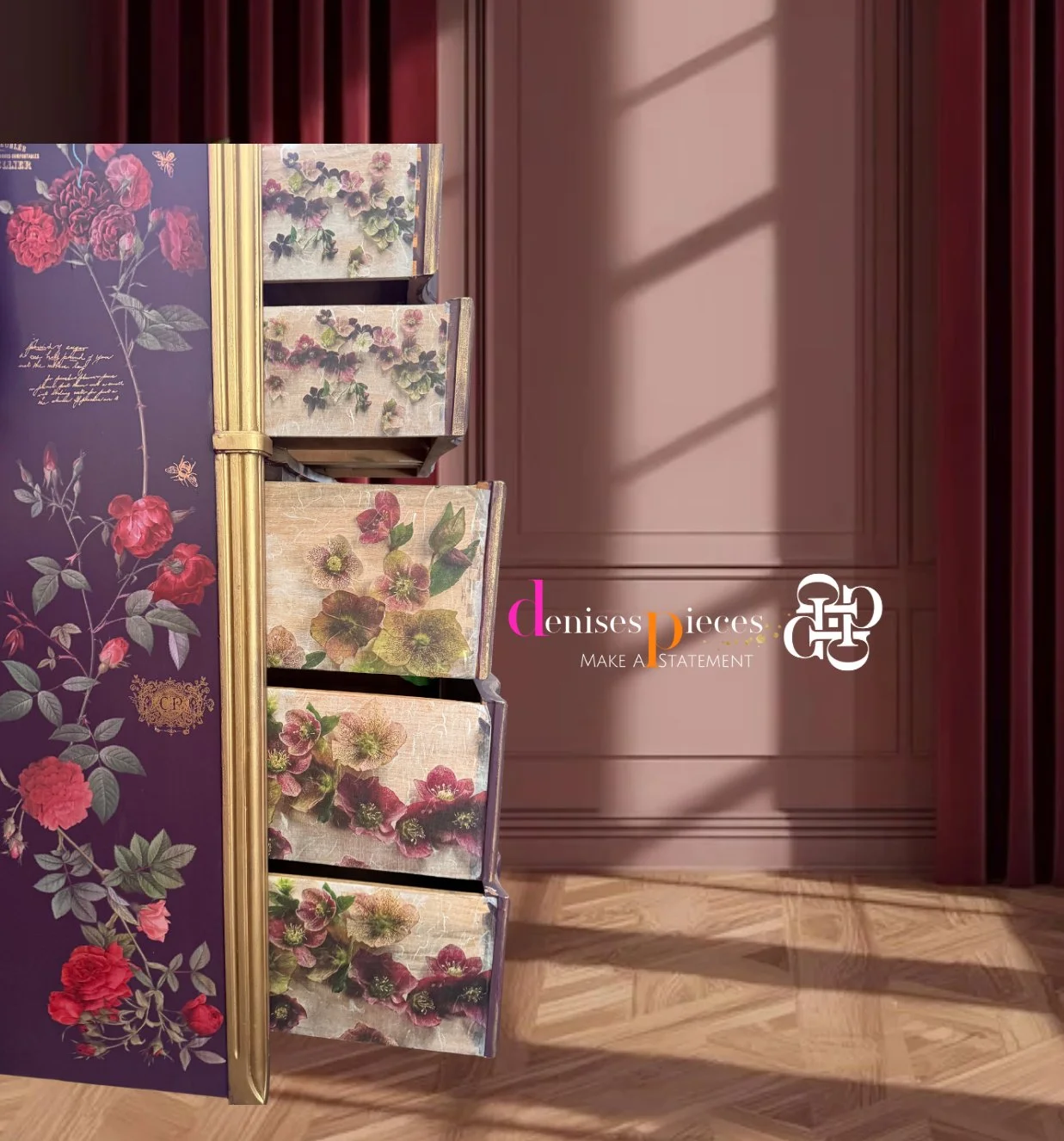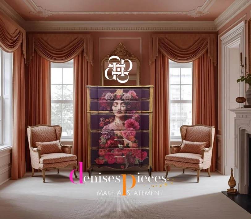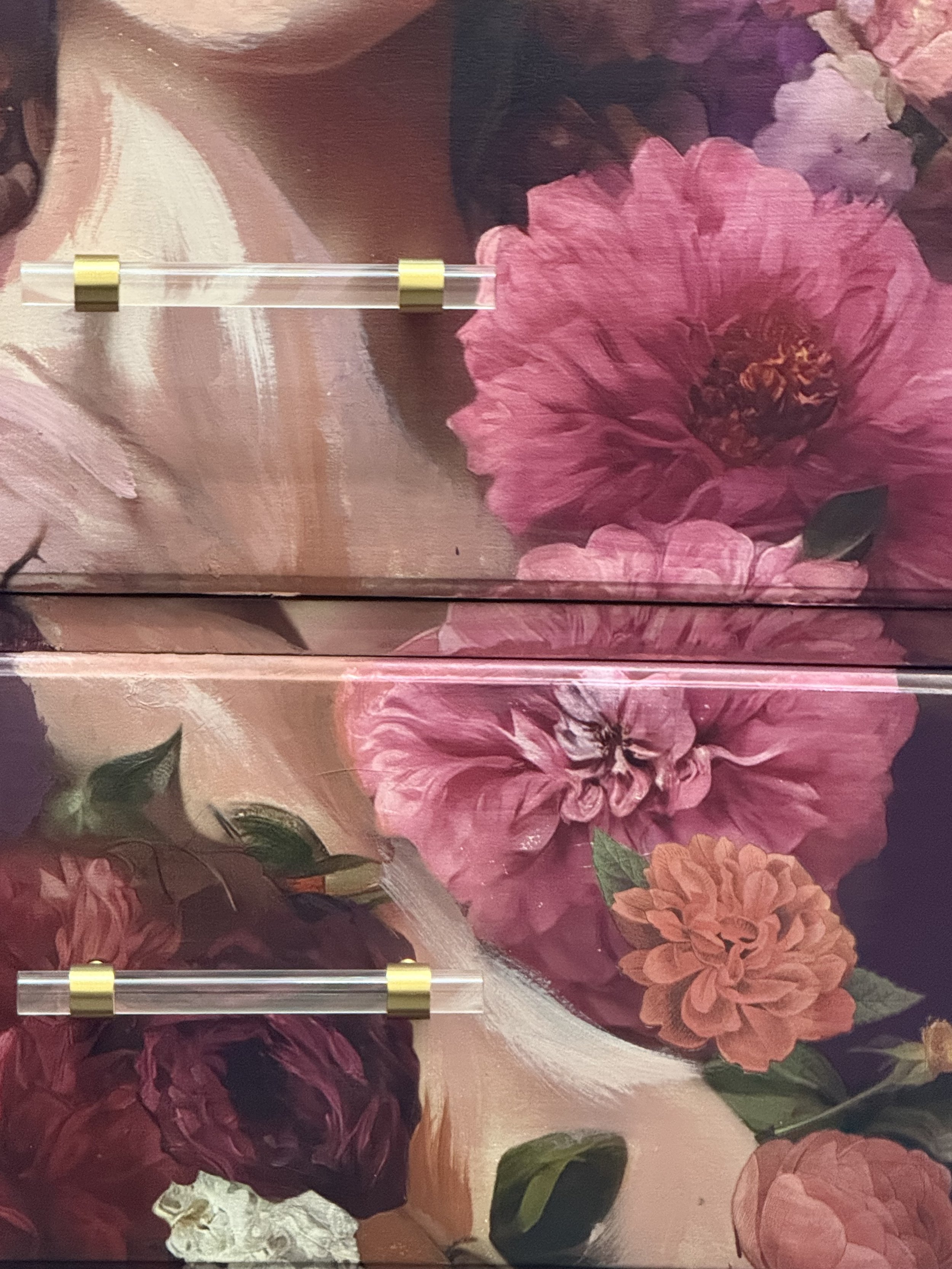 It all begins with an idea. I’ve had this stunning image in my stash for quite a while just waiting for the perfect piece to complement it.. This exquisite chest of drawers came along and it was a match!!! Customer mixed hot pinks and purple with loads of florals and gold wax, this piece is a true maximalist and really makes a statement.. The sides of the drawers are decoupaged with florals and the drawers are lined with a complementing heavy duty bright gold geometric paper. Brand new lucite hardware adds the final touch..